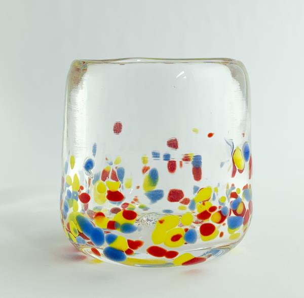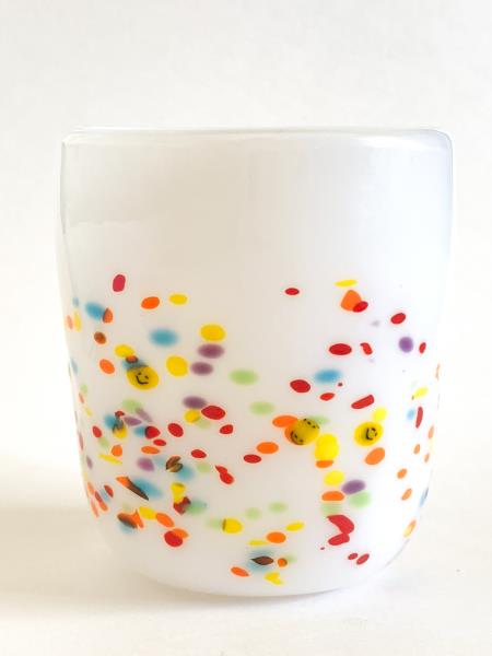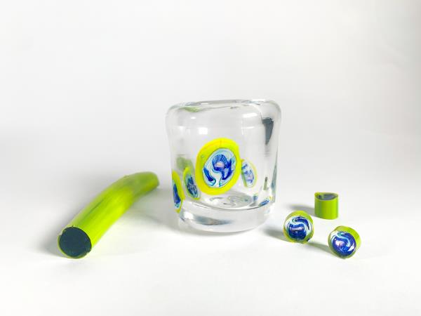 Happy face murrini pulled in the hot shop, rolled onto blown vessel